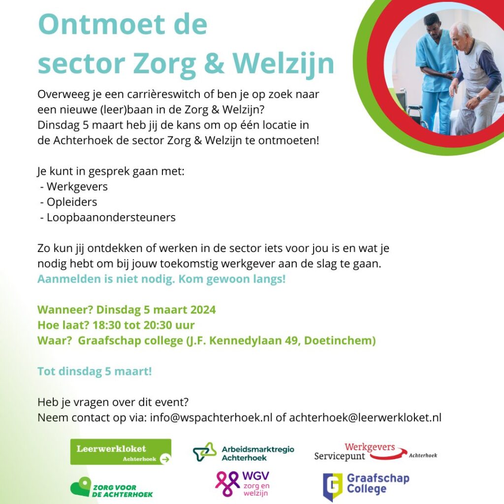 Op dinsdagavond 5 maart organiseren Leerwerkloket Achterhoek, WerkgeversServicepunt Achterhoek, WGV zorg en welzijn, Graafschap College en de Arbeidsmarktregio Achterhoek samen voor de vierde keer de informatiebijeenkomst ‘Ontmoet de sector Zorg en Welzijn’. Bezoekers kunnen kennismaken met een divers aanbod van werkgevers, actief in alle gemeenten van de Achterhoek. Van gehandicaptenzorg, ouderenzorg en thuiszorg tot aan het werken in een ziekenhuis, maar ook kinderopvang of geestelijke gezondheidszorg.